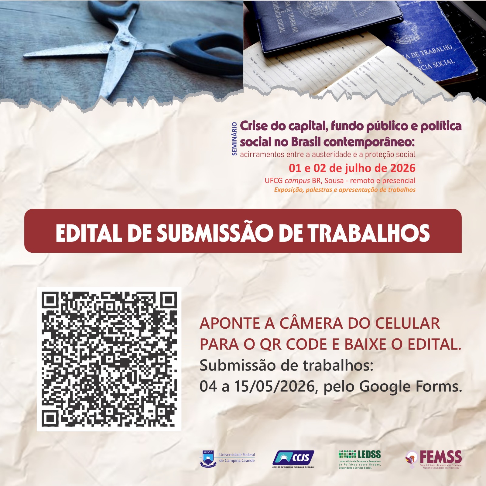 O Laboratório de Estudos e Pesquisas de Políticas sobre Drogas, Seguridade e Serviço Social (LEDSS) e o Grupo de Estudos e Pesquisas sobre Feminismo, Marxismo, Sexualidades e Serviço Social (FEMSS), vinculados ao Centro de Ciências Jurídicas e Sociais da Universidade Federal de Campina Grande (CCJS-UFCG), tornam pública a abertura de inscrições de participação e de seleção para apresentação de trabalhos científico-acadêmicos em níveis de graduação e de pós-graduação no Seminário “Crise do Capital, Fundo Público e Política Social no Brasil Contemporâneo – acirramentos entre a austeridade e a proteção social”, a ser realizado nos dias 01 e 02 de julho de 2026.